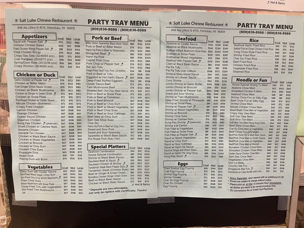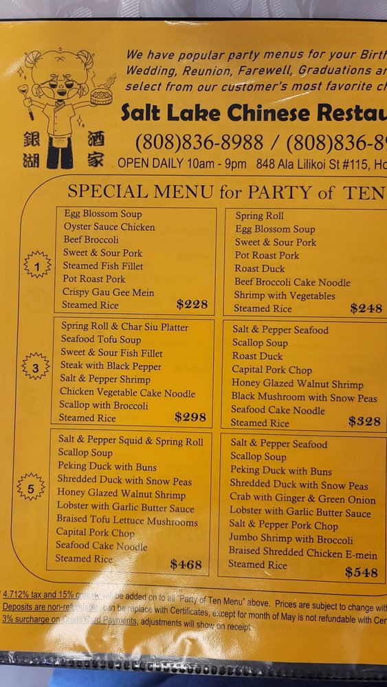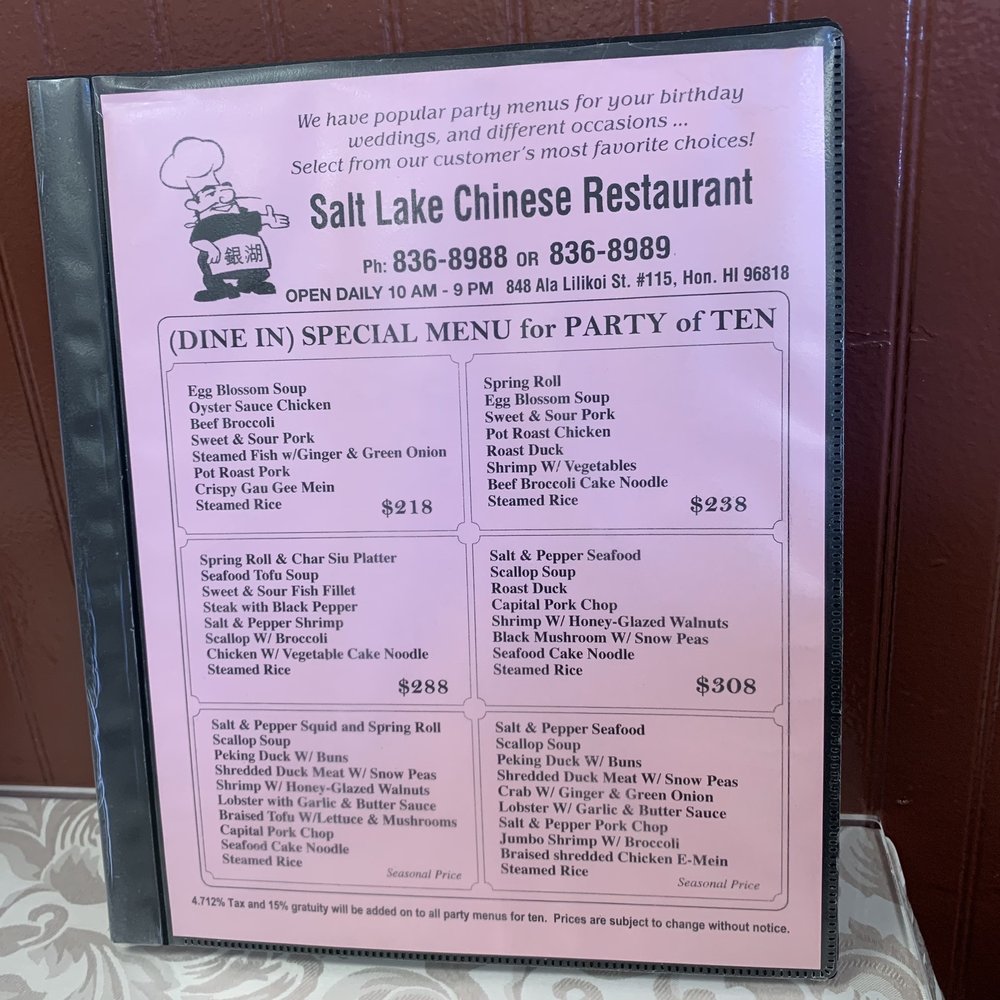 Salt Lake Chinese Restaurant offers a unique dining experience in Honolulu, HI. This Chinese restaurant provides a variety of options like Crispy Won Ton, Chicken with Vegetable Soup, Stuffed Duck, and Lemon Chicken. Customers have praised the delicious food and quick service, with favorites including Minute Chicken Cake Noodle and Sweet & Sour Spare Ribs. The restaurant is known for its convenient location, friendly staff, and cozy atmosphere. With options for takeout, delivery, and catering, Salt Lake Chinese Restaurant caters to a wide range of preferences. Whether you're looking for a casual meal or a feast for a group, this restaurant has something for everyone. Overall, Salt Lake Chinese Restaurant is a go-to spot for authentic Chinese cuisine in the area.